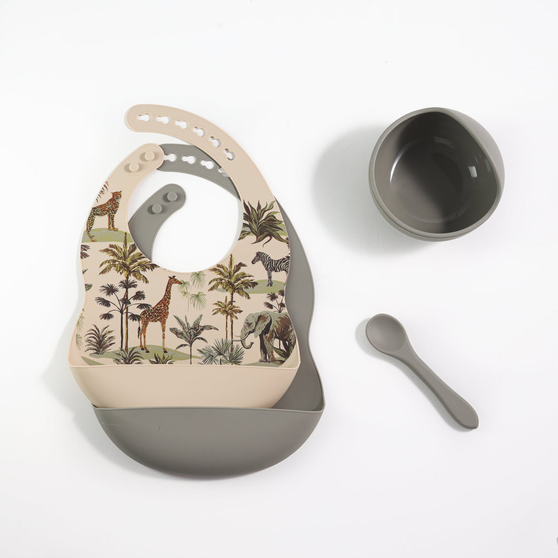 Baby feeding tableware silicone set of 3: Bib, Suction Bowl, Spoon.